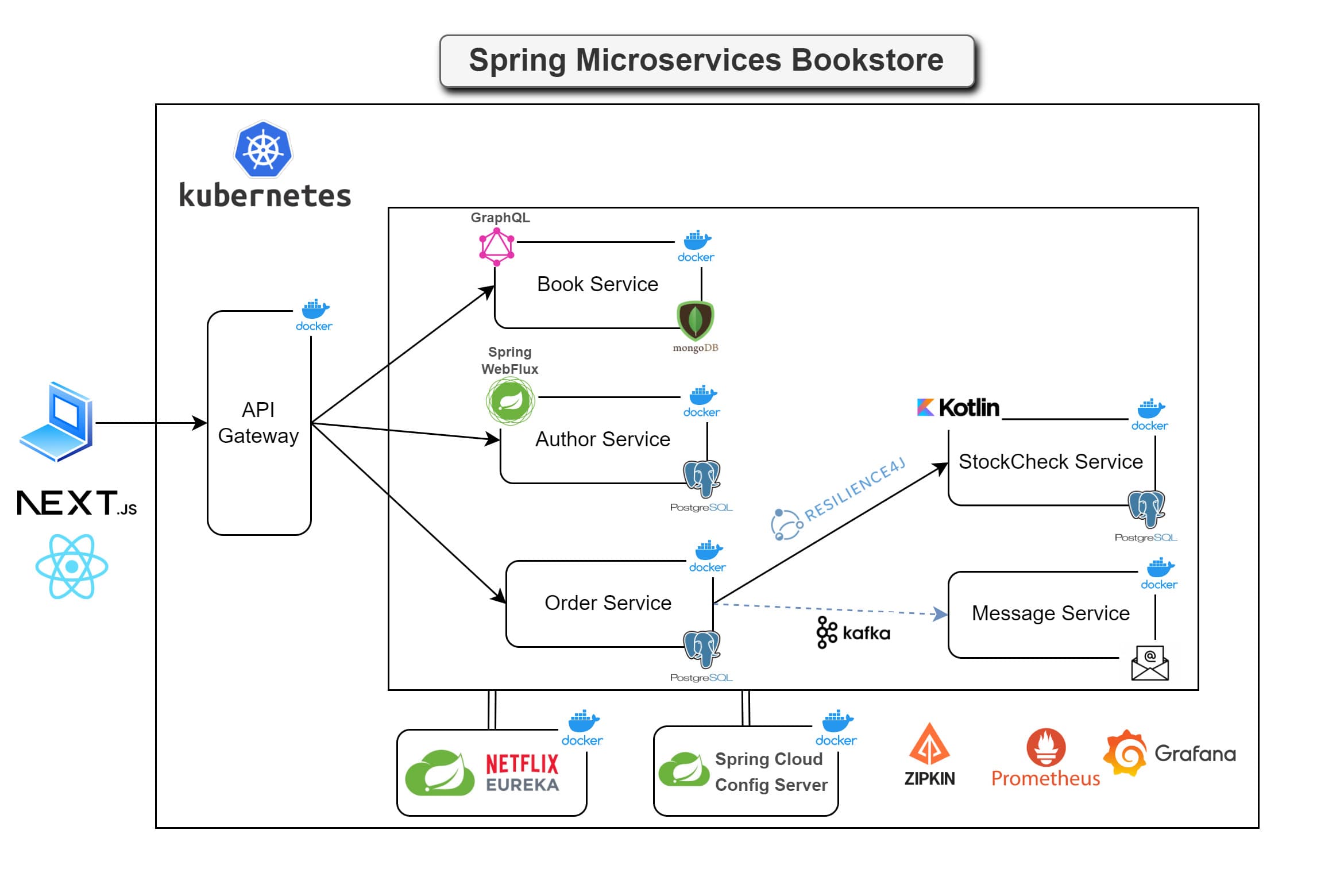 Technologies: Spring Boot, Spring Cloud, Spring WebFlux, Docker, Kubernetes, Java, Kotlin, Apache Kafka, Spring Cloud Gateway, Spring Cloud Netflix Eureka, Google JIB, GraphQL, Lombok, Mockito, Testcontainers, Resilience4J, OpenFeign, PostgreSQL, MongoDB, Spring Web, Spring Data JPA, Apache ZooKeeper, Zipkin, Prometheus, Grafana, Next.js, React.js, Tailwind CSS